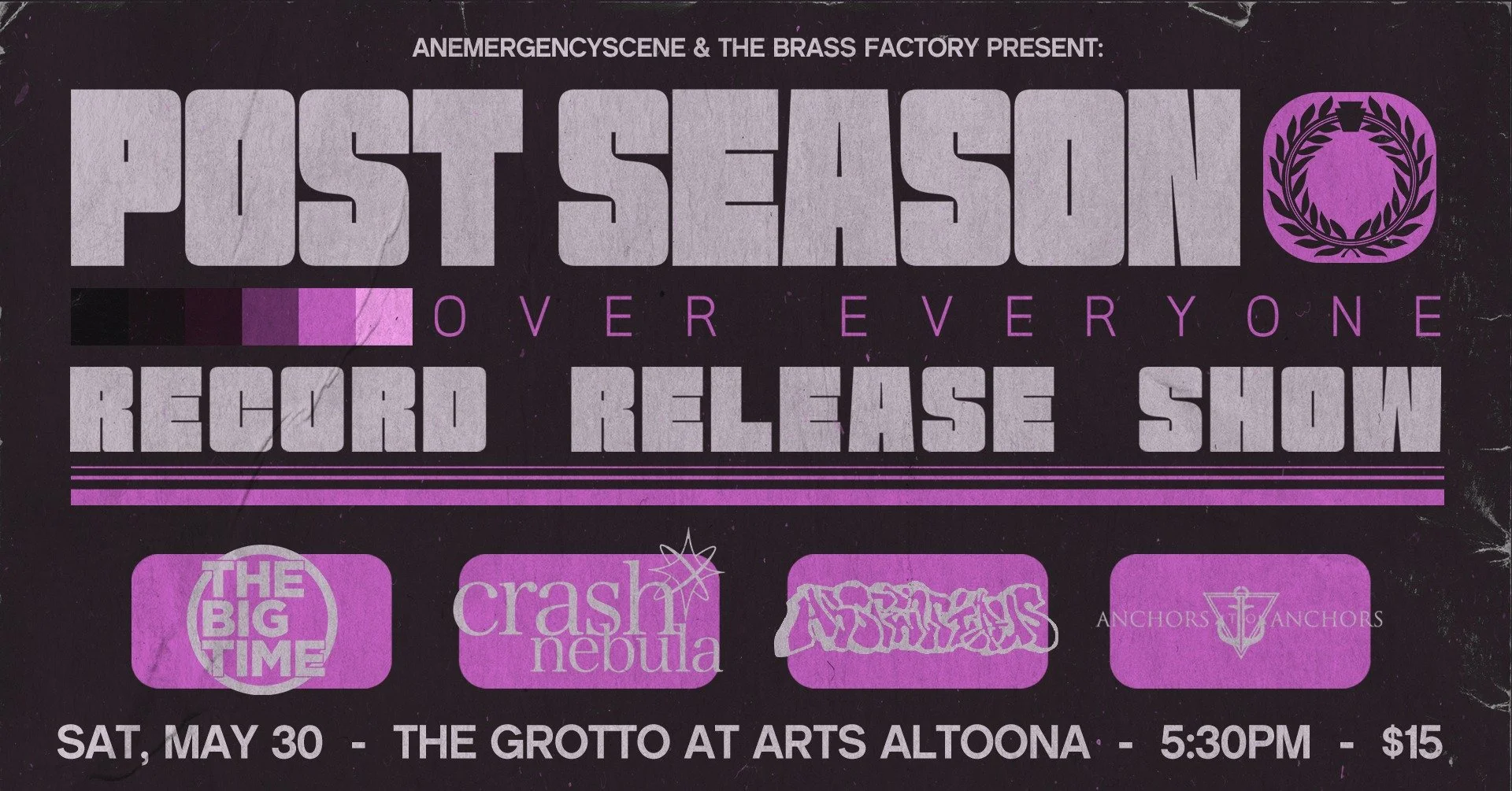 Post Season is celebrating the release of their new record "Over Everyone" this Spring with Pittsburgh's Crash Nebula on all of the East Coast record release shows. When they set a date, we immediately asked The Big Time to get the OG gang back together for the first time since 2015! Then we heard Anchors To Anchors might be starting to make some noise again. And to finish the lineup there was zero question, it had to be Abstentious!